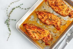 Pileći file iseći na srednje komade. Pomešati maslinovo ulje i začine, premazati meso i rasporediti na pleh obložen papirom za pečenje. Peći 25 minuta na 200°C. Nakon pečenja ostaviti da se ohladi i podeliti u porcije od oko 150 g.