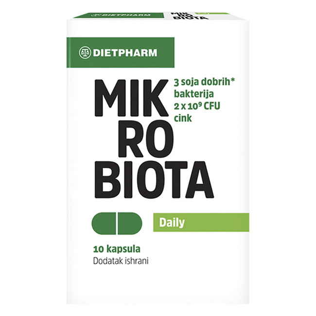 Dietpharm Mikrobiota Daily sadrži kombinaciju 3 važne, posebno odabrane, obložene i liofilizirane bakterijske kulture i cinka. Primenjuje se za vreme i nakon terapije antibioticima, kao pomoć kod poremećaja funkcionisanja creva (npr. dijareje i opstipacije različitog porekla), u periodima povećane osetljivosti na infekcije.