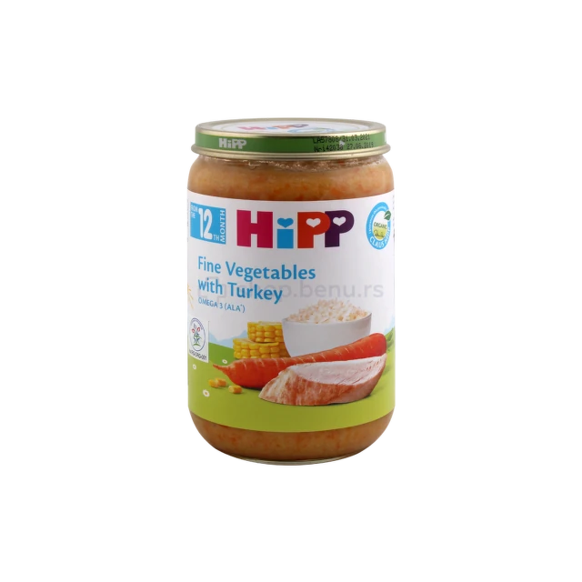Hipp kašica ćuretina sa povrćem 220g sadrži sitne komadiće kako bi bebe naučile da žvaću, sa smanjenim sadržajem soli. Bez dodatka aroma i sredstava za zgušnjavanje, bez konzervansa i veštačkih boja. Sastojci pažljivo kuvani na pari. Sa Omega-3 masnim kiselinama iz organski proizvedene uljane repice, važnih za razvoj moždanih i nervnih ćelija. Za bolje snabdevanje jodom – od suštinskog značaja za funkciju štitne žlezde. Za uzrast od 12 meseci.
