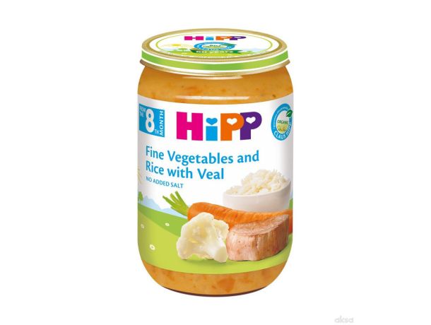 Hipp kašica povrće sa pirinčem i teletinom sadrži sitne komadiće kako bi bebe naučile da žvaću, sa smanjenim sadržajem soli. Bez dodatka aroma i sredstava za zgušnjavanje, bez konzervansa i veštačkih boja. Sastojci pažljivo kuvani na pari. Sa Omega-3 masnim kiselinama iz organski proizvedene uljane repice, važnih za razvoj moždanih i nervnih ćelija. Za bolje snabdevanje jodom – od suštinskog značaja za funkciju štitne žlezde.