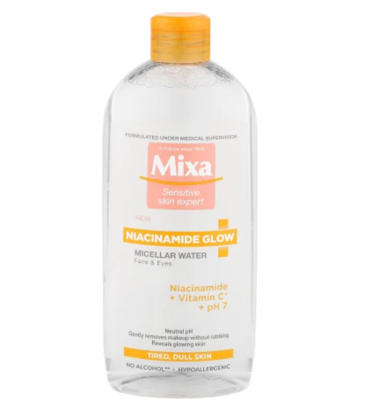 Mixa Micelarna voda Niacinamide Glow je efikasno sredstvo za uklanjanje šminke za umornu, osetljivu kožu bez sjaja.