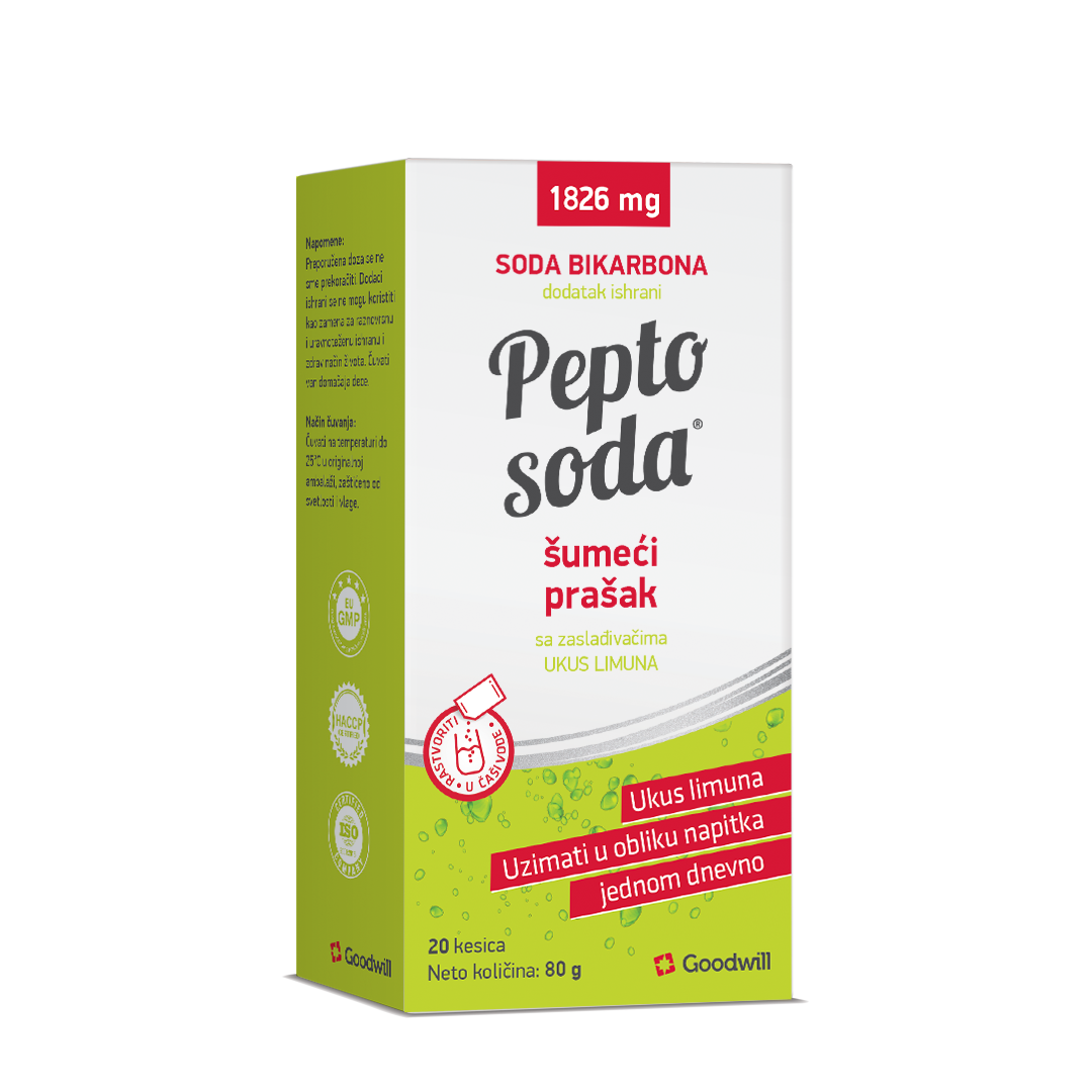 Pepto Soda je jedinstveni dodatak ishrani u vidu šumećeg praška čiji je aktivni sastojak soda bikarbona i koristi se za neutralisanje hlorovodonične kiseline u želucu. Pepto Soda doprinosi smanjenju gorušice, otklanjanju bola i drugih tegoba koji prate prekomerno lučenje želudačne kiseline.